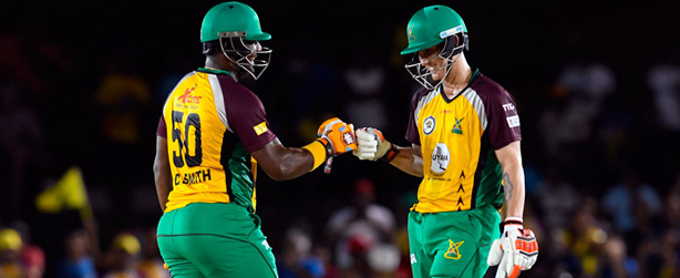 Guyana Amazon Warriors 143 for 4 (Smith 50, Maddinson 50, Reifer 2-22) beat Barbados Tridents 142 for 7 (Malik 55*, Wiese 40, Emrit 2-24) by six wickets.