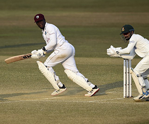 The left-hander also struck off-spinner Nayeem Hasan for a six over long on. Brathwaite played well and struck four boundaries but fell to a cut shot off Soumya Sarkar’s medium pace, three runs short of his 21st Test half-century.