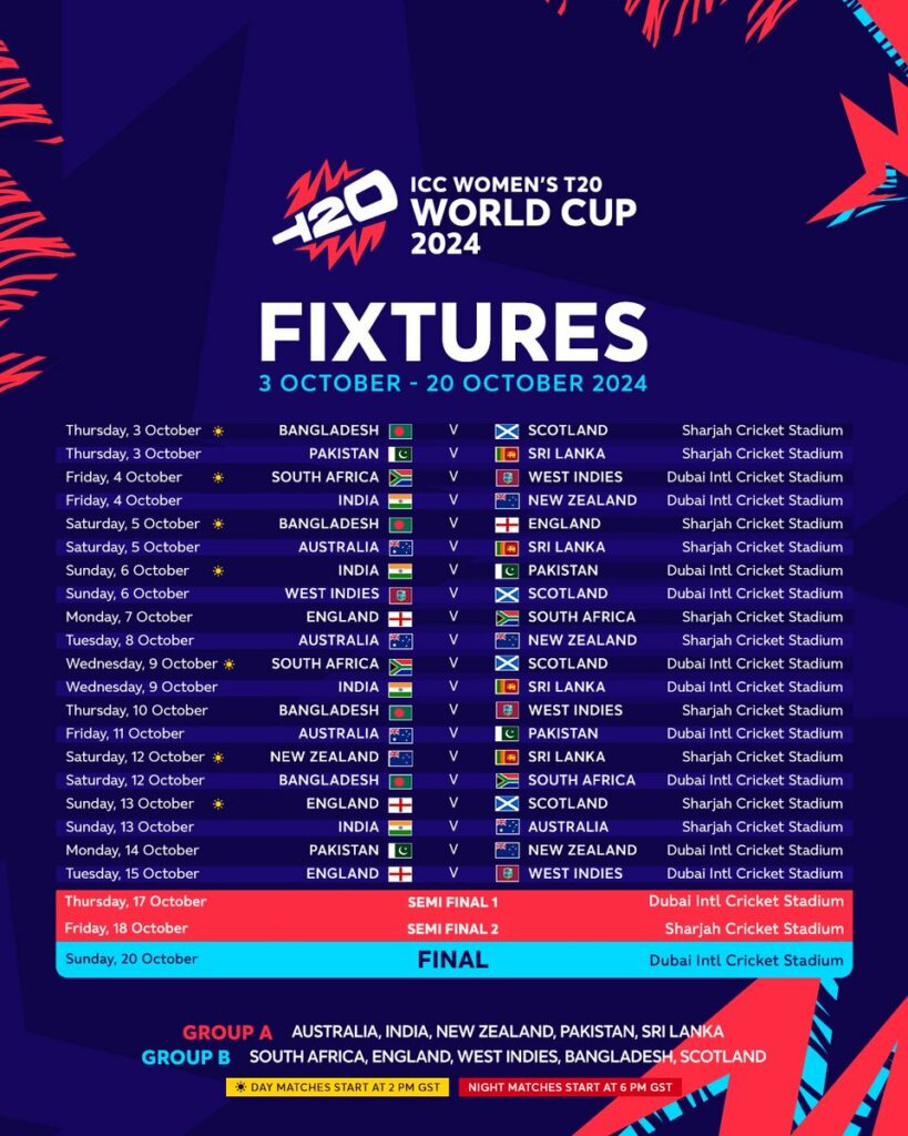 Bangladesh will take on Scotland in the opening game of the event in Sharjah with that game followed by Pakistan taking on Asia Cup winners Sri Lanka. The 2023 runners up, South Africa, will play West Indies in their opening match of the T20 World Cup on 4 October in Dubai.