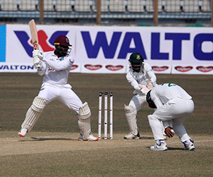 The visitors got off to a solid start from skipper Kraigg Brathwaite and left-hander John Campbell as they posted 39 runs in an hour for the first wicket. However they fell quickly as West Indies lost three wickets in space of 20 runs and found themselves struggling at 59-3. All three wickets fell to Mehidy Hasan – who has so far taken seven wickets in the match to follow up his first innings century.
