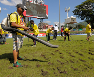 Ronald Faria, the curator, said this was because he had needed to exercise caution while watering the pitch, mindful that there may not be enough sunshine to permit the regular amount of watering. He said he was keeping a careful eye on the weather, and was watering the surface just enough to ensure it retained the optimum level of moisture – with his key going in about an eighth of an inch and no more – on the first morning.
