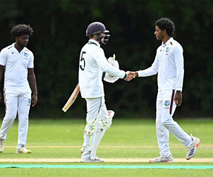 Emerging Ireland 441 all out off 112.5 overs (Andrew Balbirnie 88, Fionn Hand 79, Andy McBrine 64, Paul Stirling 32, Teddy Bishop 2-35, Nyeem Young 2-55, Kelvin Pittman 2-65, Joshua Bishop 2-72) & 30-0 off 3.5 overs