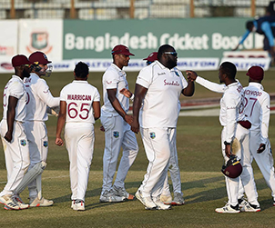 Earlier, all-rounder Shakib Al Hasan hit a patient but resolute half-century upon his return to Test cricket. He scored 68 before falling prey to the extra bounce off Cornwall. He was caught close on the off-side by captain Brathwaite